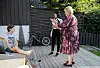 Statsminister Erna Solberg er på husbesøk med Saida Begum, Høyres ordførerkandidat i Oslo. Her møter de Stein Erik Mårstol som har skadet beinet.