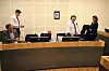 Fra venstre: Erik Smith, tidligere prosjektdirektør i Follobanen, advokat Fredrik Aadahl fra Kluge, Lars Galtung fra Follobaneprosjektet, advokat Arne Torsten Andersen fra Kluge og advokat Anne Hesjedal Sending fra Regjeringsadvokaten gjør seg klar i minuttene før retten settes.