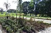 Det var endel store trær i parken fra før av, men i feltet med busker og trær ble det plass til noen nykommere. Snøbær, som ikke behøver å klippes, er den makelige hageeierens drøm. Den rødbladede blærespireaen trenger heller ikke klipp, og bidrar med herlig bladfarge blant alt det grønne. Dekorativ effekt fås også fra en nyutviklet rogn, som bidrar med blomster om sommeren og vakre røde bær om høsten. Planlagt fargeskala