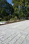 – Arealet er anlagt med to prosent fall, slik at vann kan renne vekk, sier Berg. I tillegg er det benyttet kantstein og brostein av granitt fra Beer Sten – et solid, evigvarende materiale som også kan gjenbrukes. Brosteinen som er valgt til Den enkle hagen er Beer Spesial i halv tykkelse og med en unik naturplan overflate. Dekorativ vinkelkantstein i granitt er brukt i overgangen mellom plen og beplantning, og fungerer samtidig som forsterkning av kantene.