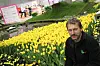 Finn Schjøll beunderer tulipanene i Namls utstillingshage på Hagemessen 2014. (Foto: Svanhild Blakstad)