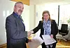 Halvor Langseth og Siri Bergh overleverer kravene foran årets lønnsoppgjør til hverandre.