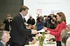 LOs leder Hans-Christian Gabrielsen gir NHOs administrerende direktør Kristin Skogen Lund krav ved starten av tarifforhandlingene 2018. LO og NHO representerer samtlige overenskomster mellom partene.