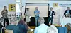 F.v. Avdelingsdirektør Erik Frogner i AF Gruppen, Anette Aanesland, administrerende direktør i Nye Veier, Eirik Sivertsen,, stortingsrepresentant for AP, samferdselsminister Knut Arild Hareide og ordstyrer Ketil Søyland.