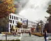 - Innad åpner to atrier bygget og binder de mange funksjonene sammen, mens bygget utad trer åpent og markant fram i bybildet - ikke minst i kraft av fasadene som er kledd i naturstein og i sammensetningen av de romhøye vinduspartiene. Tilknytningen til byen reflekteres også i adkomsttorvet ved hovedinngangen, som med sine trær, beplantning og oppholds muligheter gir nye kvaliteter til omgivelsene. Samtidig flyttes parkering fra gatenivå til en parkeringskjeller under bygget, slik at det skapes rom for et levende og innbydende bygulv, heter det i en uttalelse fra arkitekten.