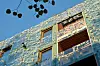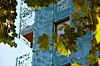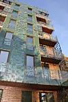 Fasaden består av glassplater med et grønt design i flere overlappende lag, og innenfor er det et lag med resirkulerte, grønne aluminiumsplater.