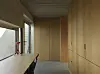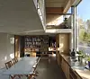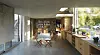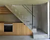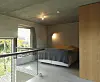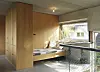 De ukonvensjonelle overgangene i betongelementene utvendig går igjen I husets interiør, der man finner soner som kobler sammen plan og snitt på en fin måte. Det er i tillegg komponenter av eikefinér i innredningen som ytterligere deler boligens funksjoner opp i underdeler av soner og ulike rom. Innredningen er plassbygget, og tilrettelagt på en så effektiv måte at man får en følelse av at boligen er større enn den faktisk er. Interiøret med sin presise utførelse og høye detaljeringsgrad skaper en opplevelse av noe vakkert og trygt, som kontrast til det grove og robuste betongskillet mellom inne og utemiljø.