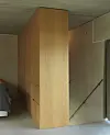 Det varme, presise og lekne interiøret i eik skaper en fin kontrast til den rå betongen.