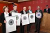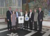 Oslo bys arkitekturpris 2014 gikk til Kuben yrkesarena. Fra venstre Espen Ophaug, nestleder i byutviklingskomiteen, Nina Tendal og Knut Nesje fra Arch Uno, prosjektleder Roar Grøtting og adm direktør Rigmor Hagen i Undervisningsbygg, Odd Erik Helåsen, Arkitektpartner, Geir Knutsen, Hjellnes Consult og ordfører Fabian Stang. (Foto: Oslo kommune/Sturlason)