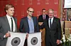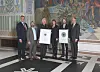 Oslo bys arkitekturpris 2014 gikk til Kuben yrkesarena. Odd Erik Helåsen i Arkitektpartner og Knut Nesje i Arch Uno mottar diplom fra ordfører Fabian Stang. (Foto: Svanhild Blakstad)
