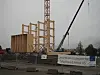 Montasjen av massivtre til det som blir trapperom og heissjakter i bygget er også i gang.