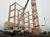 Nå blir limtrekonstruksjoner på hele 10,5 tonn i det første montasjetrinnet heist på plass.