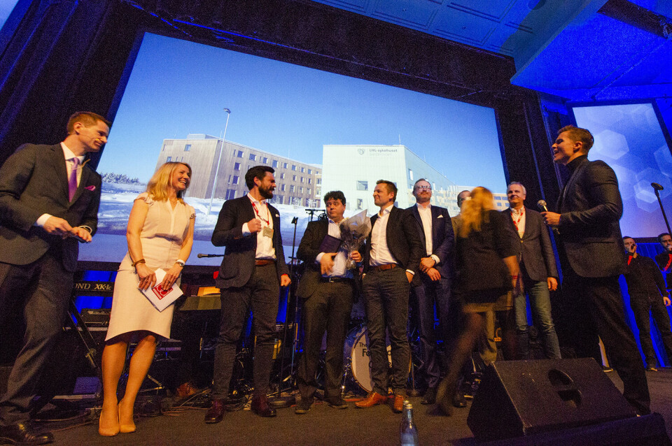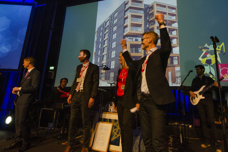Maskinparken TRE var et av tre nominerte prosjekt til Årets Trebyggeri 2018, og endte også med å vinne prisen. Ørjan Vårdal i Veidekke (fra venstre), Sigbjørn Faanes i Veidekke, Solveig Djønne Haugli i Veidekke, Katrine Falch Aune i HUS Arkitekter og Odd Grøte i WSP Engineering.