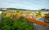 Mattak har forvandlet en grå takflate på det ikoniske Sundt-bygget til et grønt oppholdsrom med spiselige vekster. Svarthyllbusker vokser i full kraft på det grønne taket i Bergen sentrum. Foto: Mattak/Kjell Hammersland