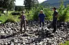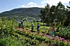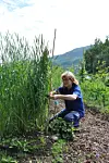 Sola glimter til over de grønne markene i Tingvoll på Nordmøre. I besøkshagen hos forskningssenteret Bioforsk Økologisk jobber ansatte med å binde opp vekster som har fått medfart av de siste dagers regnvær.