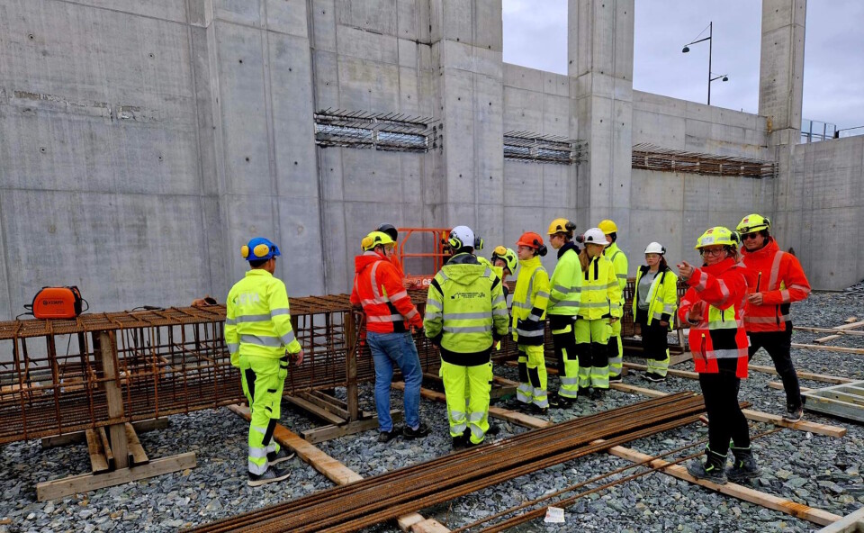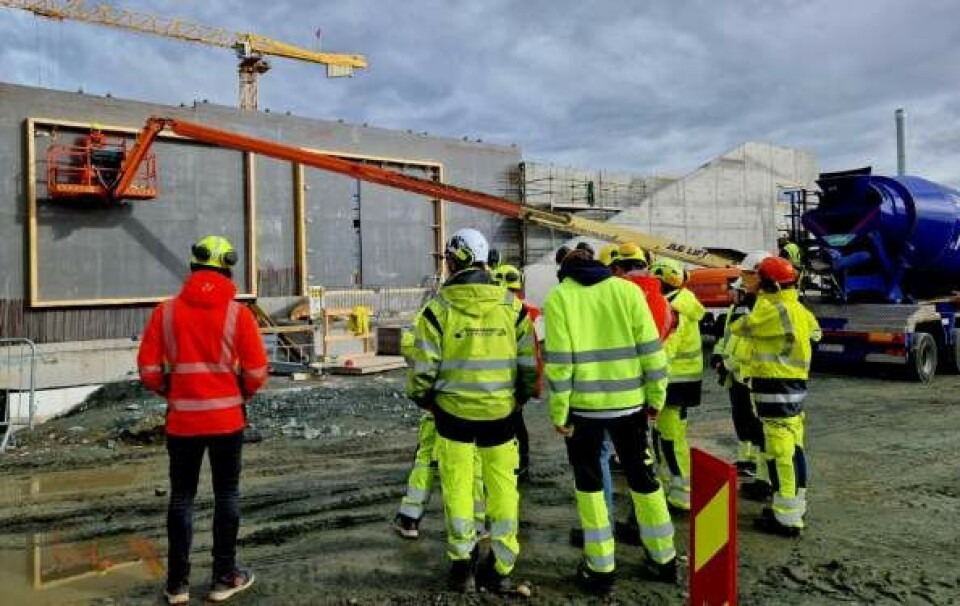 Totalt nærmere 170 skoleelever fra videregående har fått presentert betongfaget og mulighetene der under besøk på Cissi Klein videregående skole som er under bygging. Her er en av elevgruppene på plass. Foto: Veidekke/Byggopp
