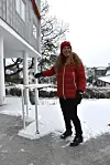 Hege Saxebøl Moum i Statsbygg viser fram bordet, hvor man kan sette fra seg vesken før man går inn.