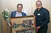 Administrerende direktør Jon Tveiten (til høyre) i Norsk Energi, overrekker årets EMIL-pris til Per Brevik, direktør for alternativ brensel og bærekraft i HeidelbergCement. Prisen er et maleri fra Brevik sentrum malt av Jo Bark i 1990.