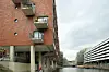 Årstall angir flomnivåene på fasade i Holzhafen, flomdører kan lukkes foran vinduer.