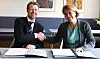 Byggherredirektør Synnøve Lyssand Sandberg i Statsbygg og konsernsjef Jørgen Evensen i Betonmast signerer kontrakten.