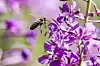 Slattum 20140720. En bie svever foran en geitramsblomst.