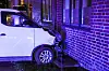 En bil havnet inn i en husvegg i Waldemar Thranes gate i Oslo onsdag kveld etter å ha vært borti en annen bil i motgående kjørefelt. Foto: Terje Bendiksby / NTB