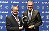 Juryformann Jarlath Sweeny (t.v) og en lykkelig prismottager, Dr. Scholz fra Volkswagen nyttekjøretøy.