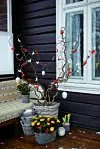 Heng opp små lykter og nostalgiske egg i trærne, eller kjøp noen kvister med Trollhassel* til å sette i en kurv på balkongen eller ved inngangspartiet. Den krokete formen gir dem et litt trolsk og magisk preg samtidig som de er ypperlige til å henge pynt på.