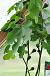 -Se på denne fikenen! I fjor spiste jeg fullmoden fiken, og den smakte godt, sier Sæterøy, og viser frem en av vekstene i drivhuset. Under et bredbremmet fikenblad lurer et stort antall kart som godgjør seg i varmen. Om vinteren får krukkevekstene bo her inne.