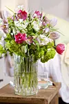 En stor bukett bugnende tulipaner i blandede farger, fanger oppmerksomheten uansett hvor de plasseres. Tulipaner passer perfekt i litt store tunge vaser med vid åpning, slik at det blir plass til en stor bukett. Er vasen i tillegg transparent, kan man også se de flotte lyse grønne stilkene som gir en fin kontrast til blomstenes farger.
