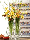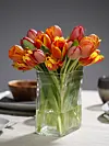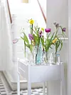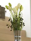 Ved å plassere tulipaner i høye slanke vaser fås et stilrent og elegant uttrykk. Her kan du blande tulipanene med andre blomster, eller holde deg til en fargeskala som går ton-i-ton. For ekstra visuell effekt, kan en gruppe vaser settes sammen, gjerne på et fat som enkelt kan flyttes etter behov.