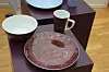 Stella Polaris porselen består av tre modeller; krus, skål og asjett. Her kan man velge mellom to farger; lyseblå med sølvstjerner eller varmbrun med gullstjerner.