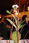 Faglærer Linda Øverby og avdelingsleder for blomsterdekoratørfag, Hansens dekorasjon. Han har laget en mansjett av magnoliabalder som er festet på oasis med knappenåler. (Foto: Dorte Finstad, Vea)