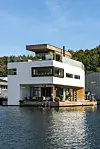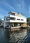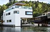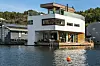 Villa W står på en 160 tonn tung flytende plattform, og er utformet som et moderne funkishus kledd i glass, hvit fiberbetong og Kebony.
