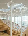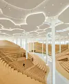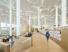 Takhøyden inne i biblioteket er hele 16 meter, med hvite løvkroner i et tak holdt oppe av hvite søyler i form av trestammer. Terrasserte områder i tre skaper inntrykk av en innendørs dal.
