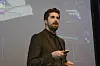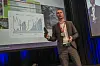 ILDDÅP: Møteleder Christian Chramer inviterer sin sønn Magnus opp på scenen for å Byggedagene 2018. Foto: Svanhild Blakstad