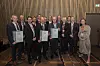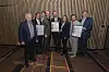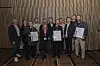 Ingvild Eikeland (bak, fra venstre), Kristian Aunaas, Marek Kovalevskij, Endre Trovik, Idar Døssland, Roger Tingvold, Torbjørn Søderholm, Asmund Hovengen, Bjørn Lindstad, Andreas Ovedal, Sølvi Tengren, Marius Ertshus Mathisen (foran, fra venstre), Torbjørn Tveit Bakketun og Hans-Egil Larsen i Dobbeltspor Arna-Bergen tok imot prisen for Årets Anlegg 2024. Foto: Sindre Sverdrup Strand