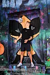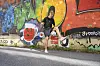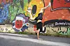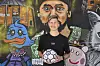 GRAFITTI. Tobias’ kompis Halvor Harsem, også kjent som gateartisten Kong Halvor, har malt et digert grafittimaleri på fasaden ved inngangspartiet til Oslo Street Fotball Senter. Her er det hentet elementer fra nærmiljøet, med blant annet referanser til Fyrstikktorget. Foto: Trond Joelson