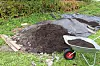 Komposthaugen dekkes med vanngjennomtrengelig svart duk (Mypex) for å hindre frøugress å etablere seg, og for at det skal kunne komme til vann. Vann og luft er to meget vesentlige ingredienser i komposten for at vi skal få til de aerobe prosessene som gir oss den gode jorda.