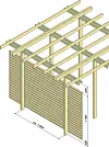 Leskjerm med liggende spilekledning kombinert med pergola. Benyttes trespiler beregnet for å stå uten overflatebehandling, for eksempel spiler av høvlet eik, vil spilekledningen få en jevnt grå farge over tid. (Illustrasjon: Byggforskserien, SINTEF Byggforsk)