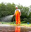 Igjen er det tid for å ta fram hageslangen. Husk at det trengs mye vann for å fjerne såperestene. Om nødvendig hjelper du til med kosten. Forsiktig bruk av høytrykkspyler er selvfølgelig mulig, men her må du være nøye. Vi er i første rekke ute etter store vannmengder – ikke høyt trykk. Holder du dysen for nær treverket har det lett for å bli fliset opp.
