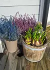 Vårstemning med krukker på trappen. (Foto: Marte Gulbrandsen)