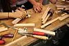 Ordfører Fabian Stang fikk prøve snekkerferdighetene hos snekkermester Anne Cathrine Hagen under Håndverkets dag i Oslo 2. september. (Foto: Svanhild Blakstad)