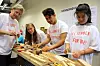 Det var et jevnt rush av ungdomsskoleelever innom standen som Gulam betjente, og det var mange som fikk prøve seg på å mure en stein eller to.