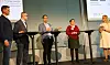 F.v. Møteleder Nina Kraugerud Ertzaa, Anita Nysæter Kristiansen, daglig leder i Backer Bolig AS, Karl Arne Jespersen kjededirektør i Mesterhus Norge, Siri Gåsemyr Staalesen (AP), medlem av kommunal- og forvaltningskomiteen og James Stove Lorentzen (H), byråd for byutvikling i Oslo. Foto: Arve Brekkhus