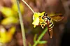 Blomsterfluer ligner på små veps. De flyr imidlertid på en egen måte og står tilnærmet stille i lufta. Foto: Erling Fløistad.