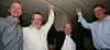 Stein Borgen fra Maxit (nr 2 fra høyre) markerer seier til Stein Gunnar Haugen og Håvard Kjesbu. Til venstre Johan Stieng fra Maxit i Trøndelag.