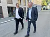 Kommunal- og distriktsminister Bjørnar Skjæran (Ap) sammen med statssekretær Martin Østtveit-Moe på vei fra møtet med Direktoratet for byggkvalitet (DiBK).