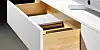 Håndtaksløse skuffer passer bra i situasjoner der du bruker hendene til andre ting eller av andre årsaker ikke vil berøre skuffefronten med hendene. Med Hettichs løsninger kreves det bare et lett trykk med hoften eller kneet for å åpne skuffen på en smidig måte.