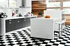 På de klikkbare flisene monteres linoleumsjiktet på en vannavstøtende HDF-plate og et underlag av naturkork, noe som gir god komfort. Gulvet kommer som paneler på 90 cm x 30 cm og fliser på 30 cm x 30 cm, og i 21 farger som enkelt kan kombineres slik at du kan lage ditt eget unike og dekorative kjøkkengulv.